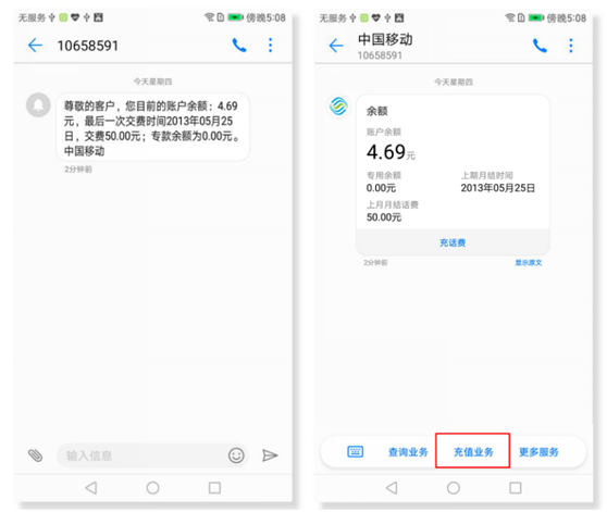 智能短信可以让用户在短信界面直接显示充值入口,但点击进入之后仍需跳转至官网或第三方完成支付。